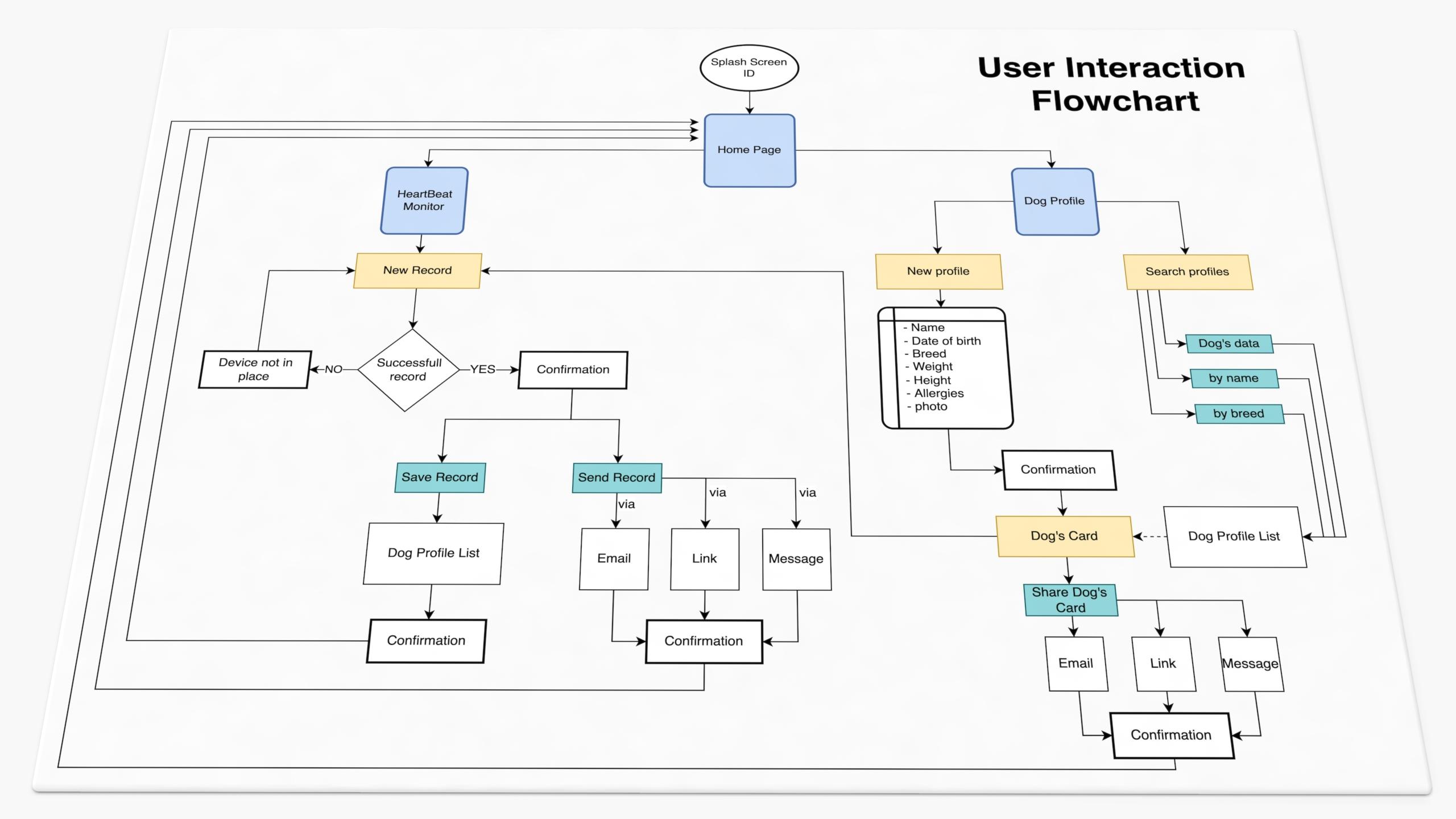 The wireframe phase established foundational screen hierarchy across five core states: splash screen, home page, heartbeat monitor, dog profiles, and recording workflow. The splash screen introduces app identity with minimal cognitive load. The home page presents two primary actions through clear visual hierarchy: HeartBeat Monitor and Dog Profile management.